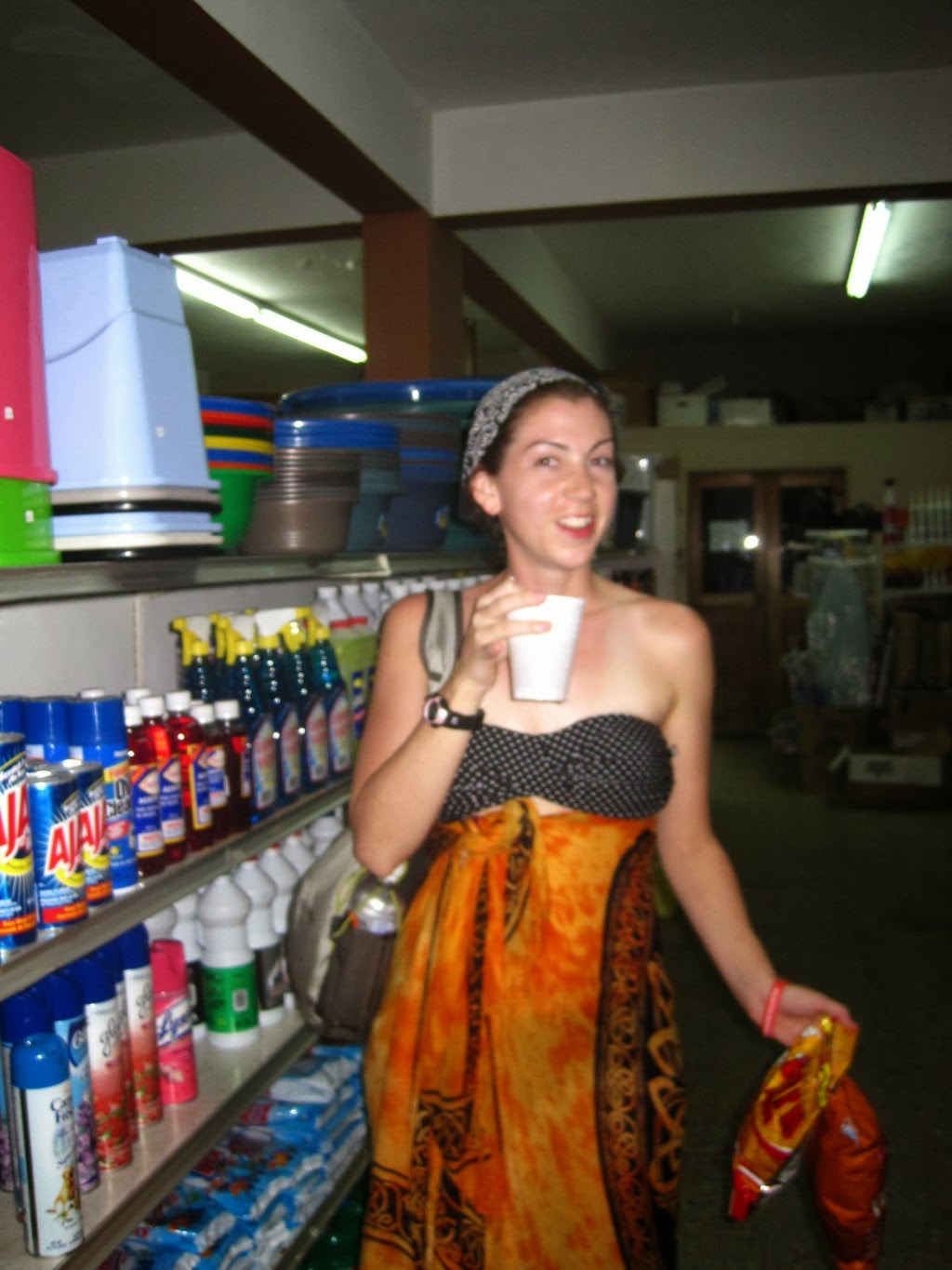 so many tourist faux pas here. good lord. uh…wearing a bikini and a sarong in a store. drinking in a store. wearing a messenger bag with a bottle of water in the side. sunburn. drunk. oh man. |