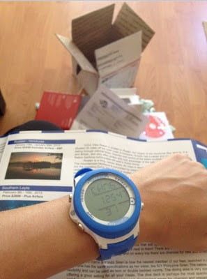 | You probably can’t tell, but the scuba vacation brochure it came with is advertising a trip to Roatan in that photo above my wrist! |