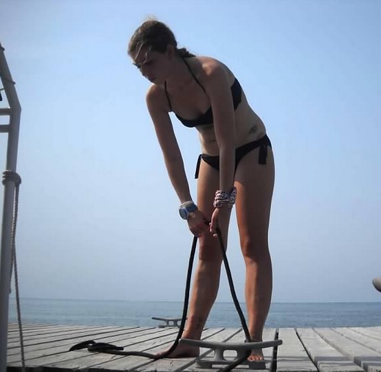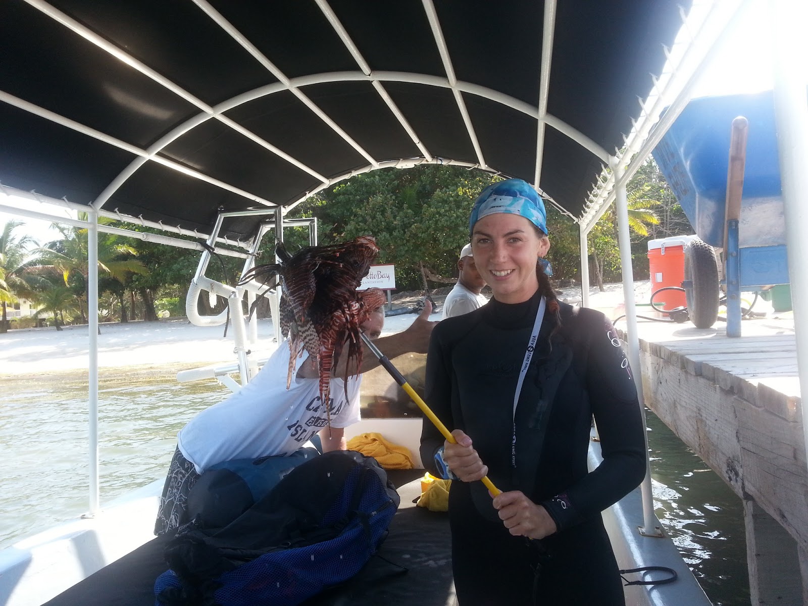I’m carrying a bucket with a cross cut into the lid – once I spear a lionfish, I jam it through the cross and the lionfish stays in the bucket while my spear slides out. If you look closely in the photo, my spear is coming out from behind my tank… you can see the elastic band of my hawaiian sling style polespear peeking up. I carry it up while I’m hunting so I don’t accidentally bang it into the delicate reef. And I’m wearing my awesome shark-print skullcap because my masks like to rip my hair out. So every dive I get my badass cap on to protect my hair!