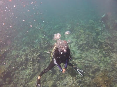Ride a scooter down a sketchy ass dirt road to work every day. Jump off a two story restaurant into the ocean. Go bushwacking in the jungle on pirate booty hunts. Carry those huge water jugs all the way into my house and get them into the dispenser without spilling it everywhere. Push wheelbarrows full of scuba tanks up and down a sandy beach all day long. Freedive to 60ft. Swim with sharks.