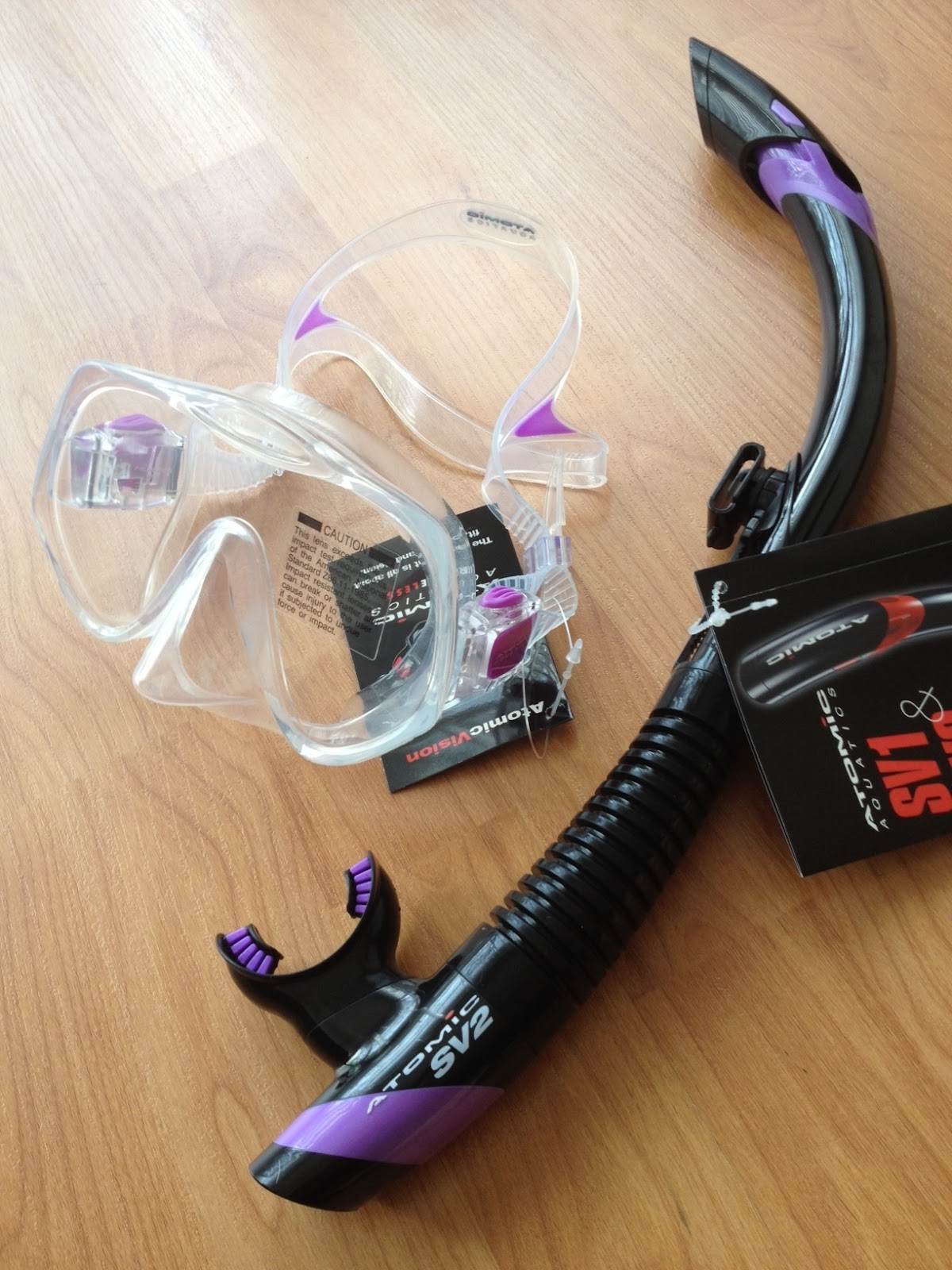 I got these bad boys (girls?) at the IDC Dive Shop thanks to the super awesome Royse, who so kindly gave me a discount on my purchase as I waited around the shop for a long time for him one afternoon while he helped other customers. They didn’t have the size of mask I needed – this mask is Atomic’s “medium fit” model (since I have what my mom calls a “peanut head” and my Roatan travel buddy called a “petite face”…thanks ladies) so Royse ordered it in for me. That guy is a mind reader because I was going to get a different black Tusa snorkel, and the regular clear mask and he ordered me this badass purple combo! I love it! I cleaned my mask with toothpaste and got it all put together, showed it off to my dad on Skype like a nerd and then took it for a test run in the shower (good thing I live by myself….what a weirdo) and it was great! Can’t wait to take it out in the pool on Sunday.