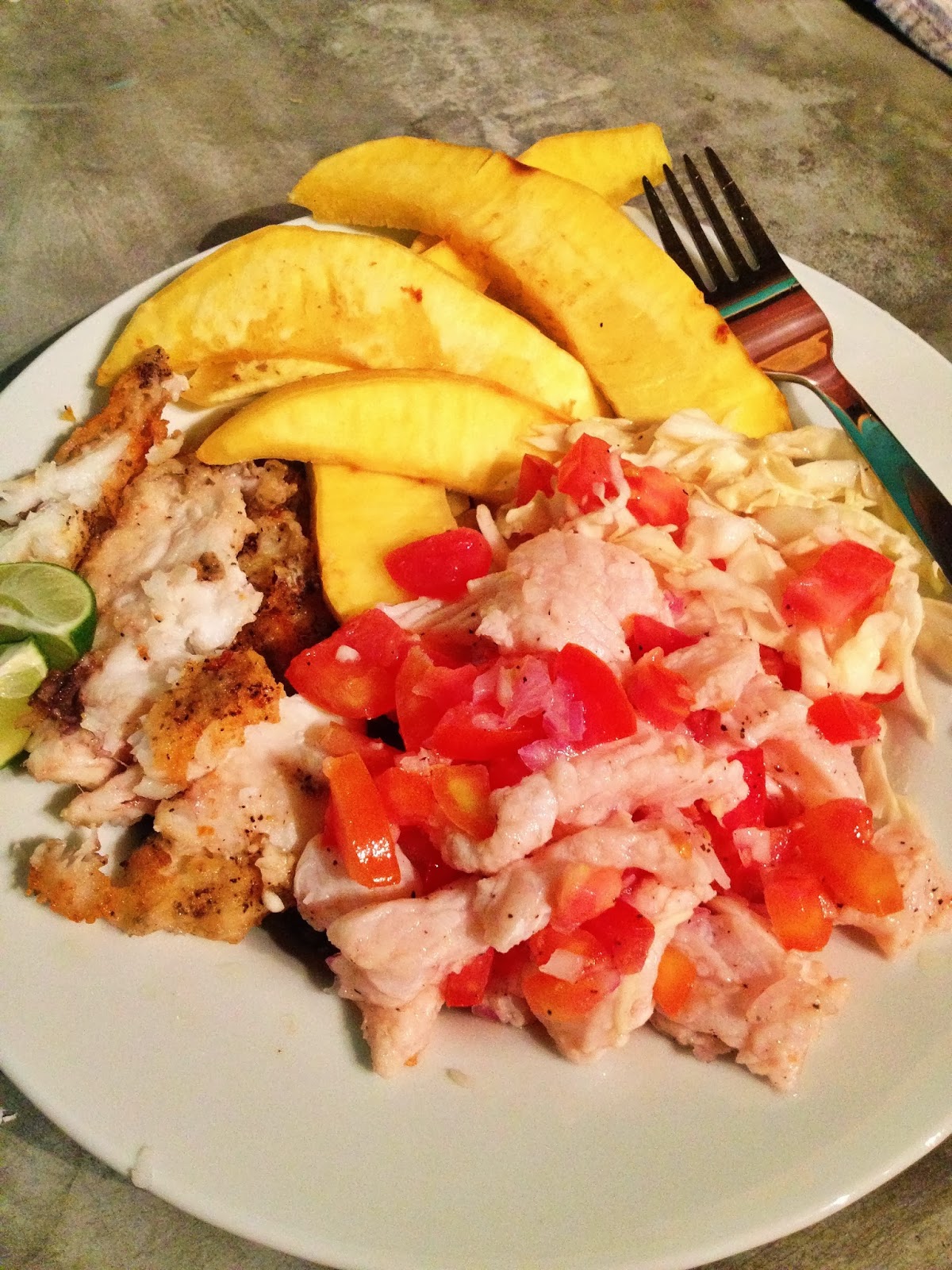 pan-fried lionfish, lionfish ceviche, cabbage salad and fried breadfruit |