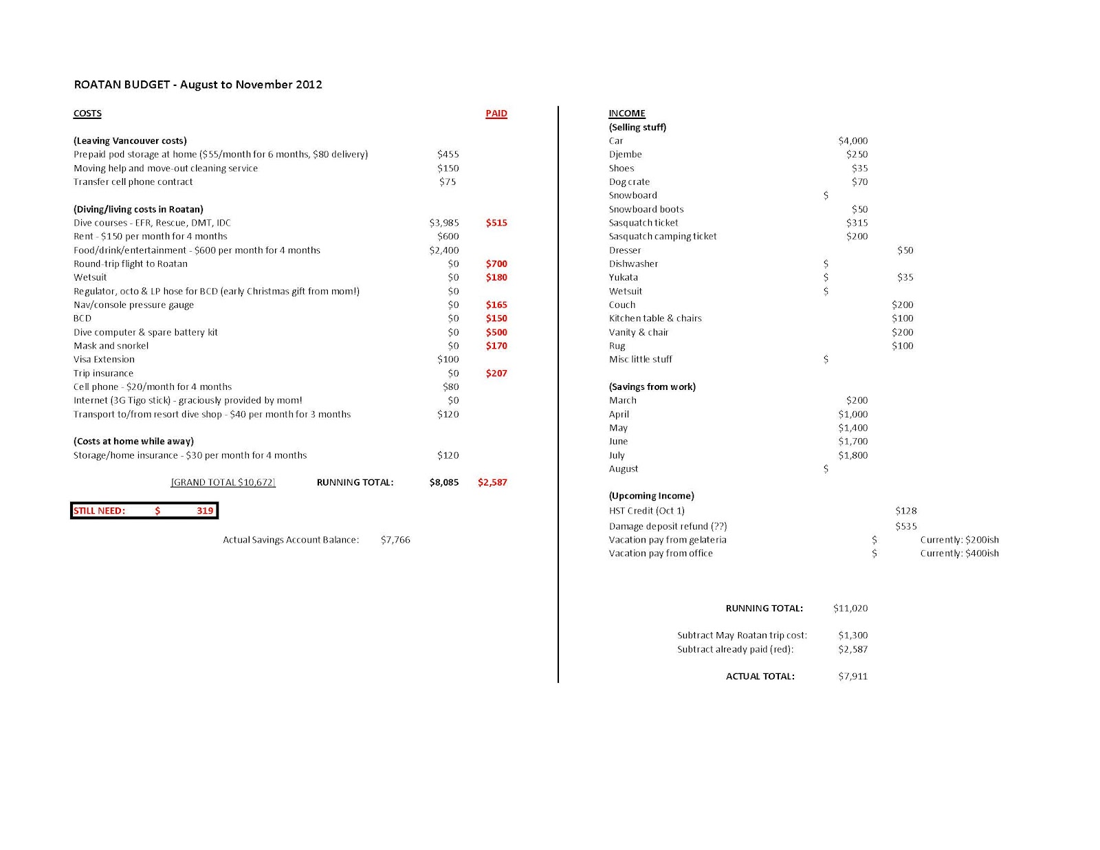 You can see things have changed a bit on the budget since the last one I posted. I changed the expenses side around a bit to reflect the different categories, and I also found ways to get rid of almost every expense in Vancouver while I am away so I don’t have to worry about paying stuff at home every month. You can see from this one that I have managed to get rid of paying for my cell phone while I’m gone (hopefully) – I called the company to find out what I can do and their suggestion was to transfer the contract to someone else. You just pay a $25 transfer fee and then someone else takes over your contract! Brilliant! So I have mine listed on Craigslist and have had a few bites, really hoping one pans out. I have offered to give $50 to whoever takes it over as an incentive (and that’s still way cheaper than me paying for it while I’m away). Please keep your fingers crossed for me on this one as it’s a huge expense that I need to not have! I also have gotten rid of the bank fees – I had an appointment with a bank representative to find out how to minimize fees while I’m away…I get dinged about $5-8 extra every time I use an ATM in Roatan, plus I was paying $11/month for regular bank fees. I’m switching to a 10 transaction per month plan as I will hardly ever be using my debit card there, and that plan costs $4.95/month but because I have a debit card, credit card, RRSP and TFSA with that bank they are going to waive the monthly fee! Every little bit counts.