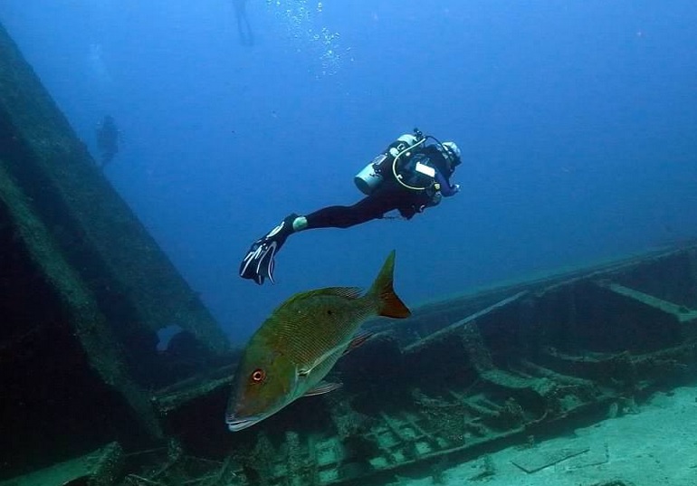 Yeah!!! The sandy bottom there is about 115ft and the top of the mast there is at about 55ft. It is such a fun dive!