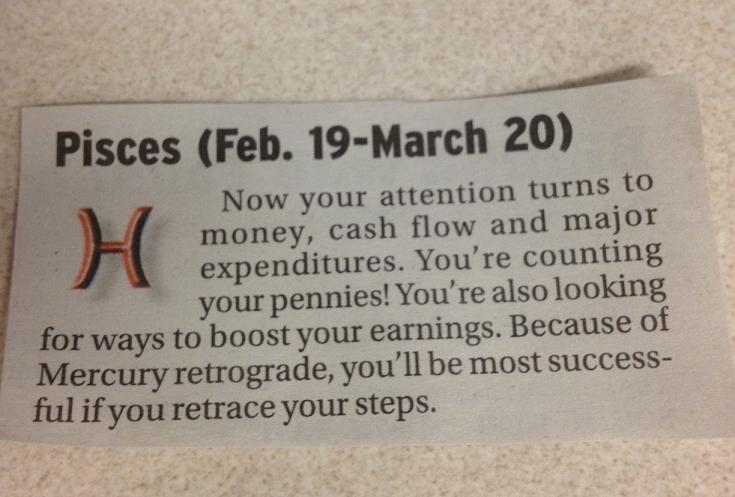 I love accurate horoscopes! Here are mine for today, first from the Globe & Mail and then the Vancouver Sun (thanks to my co-worker for reading it, laughing, and then showing me…and sorry to the rest of the Pisceans in the office, cause I totally cut it out of the paper):